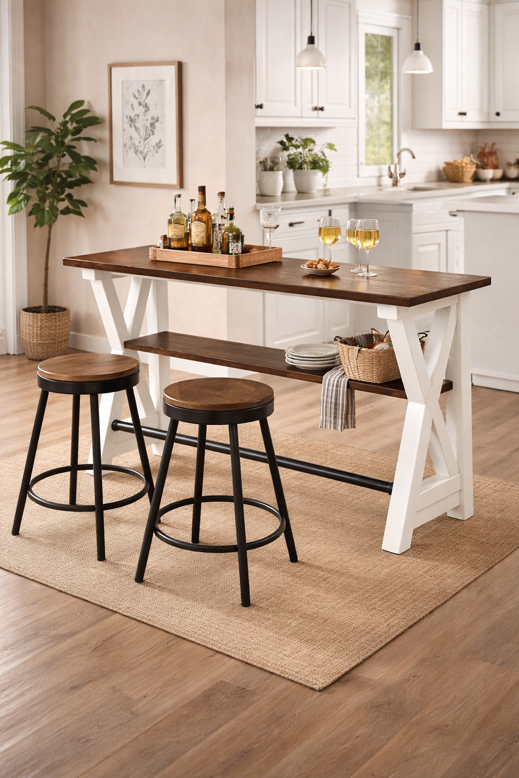 This modern bar table features a solid wood tabletop with a sturdy frame and a built-in lower shelf for added storage. Designed for kitchens, dining areas, and open living spaces, it offers both style and functionality. The clean lines and warm wood finish make it ideal for casual dining, entertaining, or everyday use.